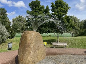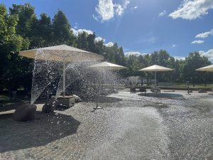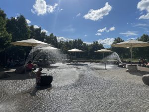 換好衣服、塗好太陽油後,女兒已經急不及待走進這個玩水公園。記得在香港時,女兒也很喜歡到這種玩水的公園玩(屯門市中心的共融公園),但通常會非常擠迫,而且總有不同的設施正在維修中。當天應該也有28″C,不過Wasserspielplatz Nidda Park中噴出來的水不是暖水,濕身後也有冰冰的感覺。整個Wasserspielplatz Nidda Park不是很大,不過噴水方式也不是單一,按時會從不同的石塊或噴水口出水,大約是每十分鐘會調換一下的感覺。